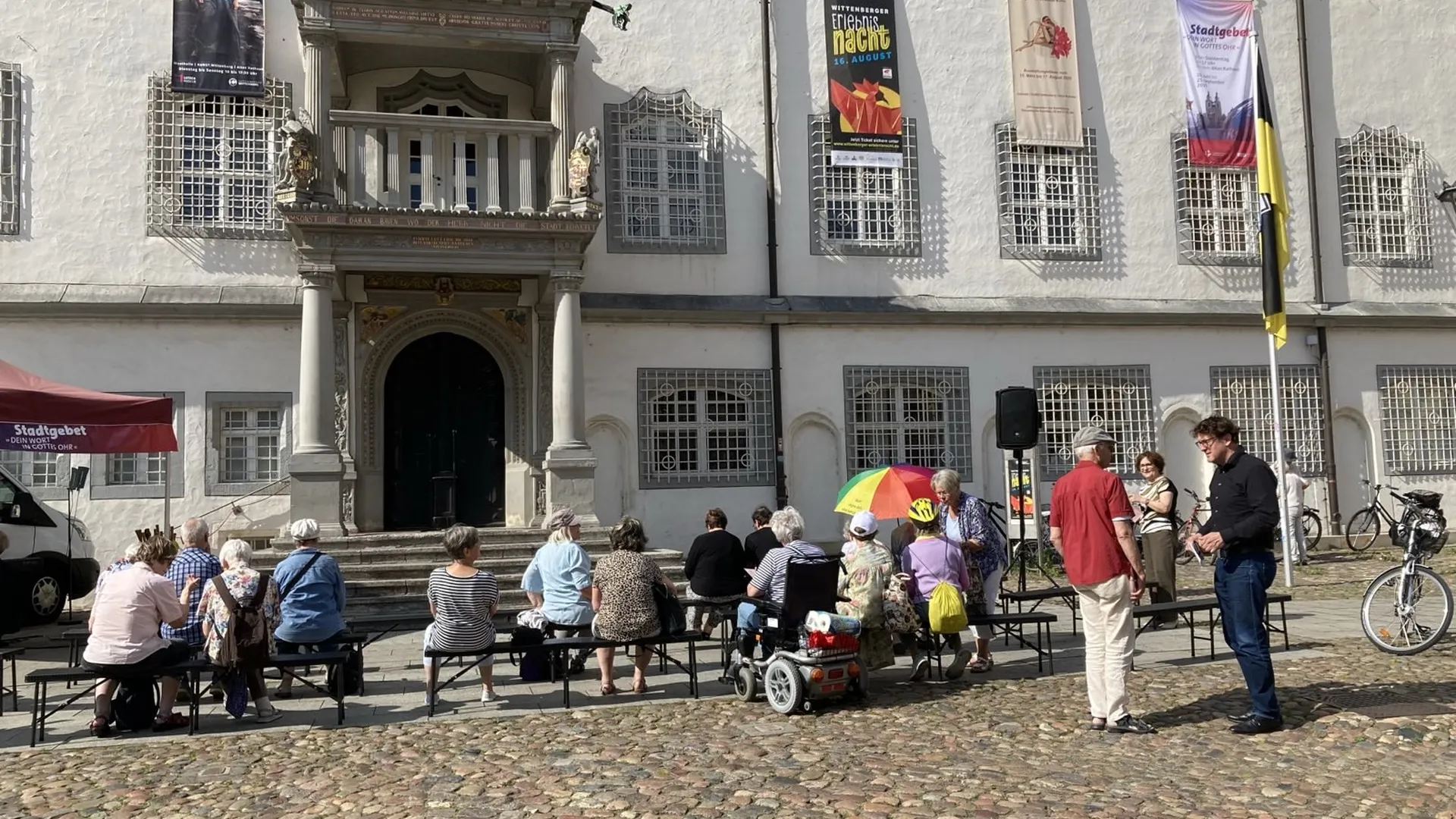 Auch in diesem Jahr findet in Wittenberg wieder das Stadtgebet geben. Es geht mittlerweile in die 5. Saison. Vom 19. Juni bis zum 25. September wird es immer donnerstags um 17.00 Uhr auf dem Wittenberger Marktplatz heißen „Dein Wort in Gottes Ohr“. Begleitet von Musik, biblischer Lesung und einem Gebet werden Menschen aus der Stadt mit den Zuhörerinnen und Zuhörern teilen, was sie auf dem Herzen haben. Auch auf dem Marktplatz ist die Gedenkskulptur „Restlicht“ des Münchner Künstler Werner Mally, die vom 21. Juni bis zum 31. August auf dem Markplatz zu sehen sein wird. Sie erinnert an den 80. Jahrestag des Kriegsendes und an die Befreiung von der NS-Diktatur. Wer unter diesem Pavillon steht, wird bei Sonnenschein durch die feinen Bohrungen, die an die Jahre 1938 bis 1945 gemahnen, Schattenwürfe – Tätowierungen gleich – auf seiner Haut erkennen. Zeichen gegen das Vergessen! Die Stadtkirchengemeinde Wittenberg begleitet die Aufstellung von RESTLICHT mit dem "Gedicht der Woche" eines jüdischen Dichters bzw. einer jüdischen Dichterin.